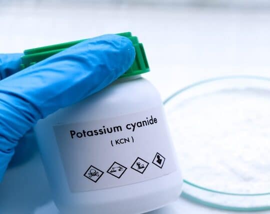 Toxizität: Kaliumcyanid ist extrem giftig und kann bereits in geringen Dosen tödlich sein. Es hemmt die Zellatmung, indem es an das Eisen im Cytochrom-c-Oxidase-Komplex in den Mitochondrien bindet und so die Sauerstoffnutzung der Zellen verhindert.